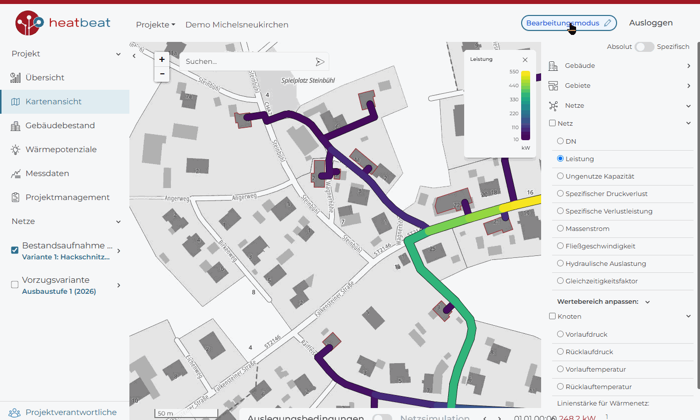 With the new edit mode, you can interactively customise your digital twin of the heating network directly in the map view. Whether you want to add or remove network connections or adjust the route of pipes, all of this can now be done intuitively and visually.